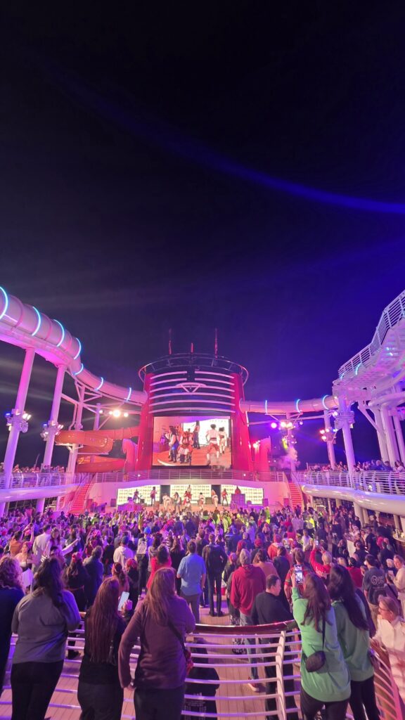 Ceremonia de presentación de cuatro horas y primera “Sail Away Party” nocturna en un barco Disney.